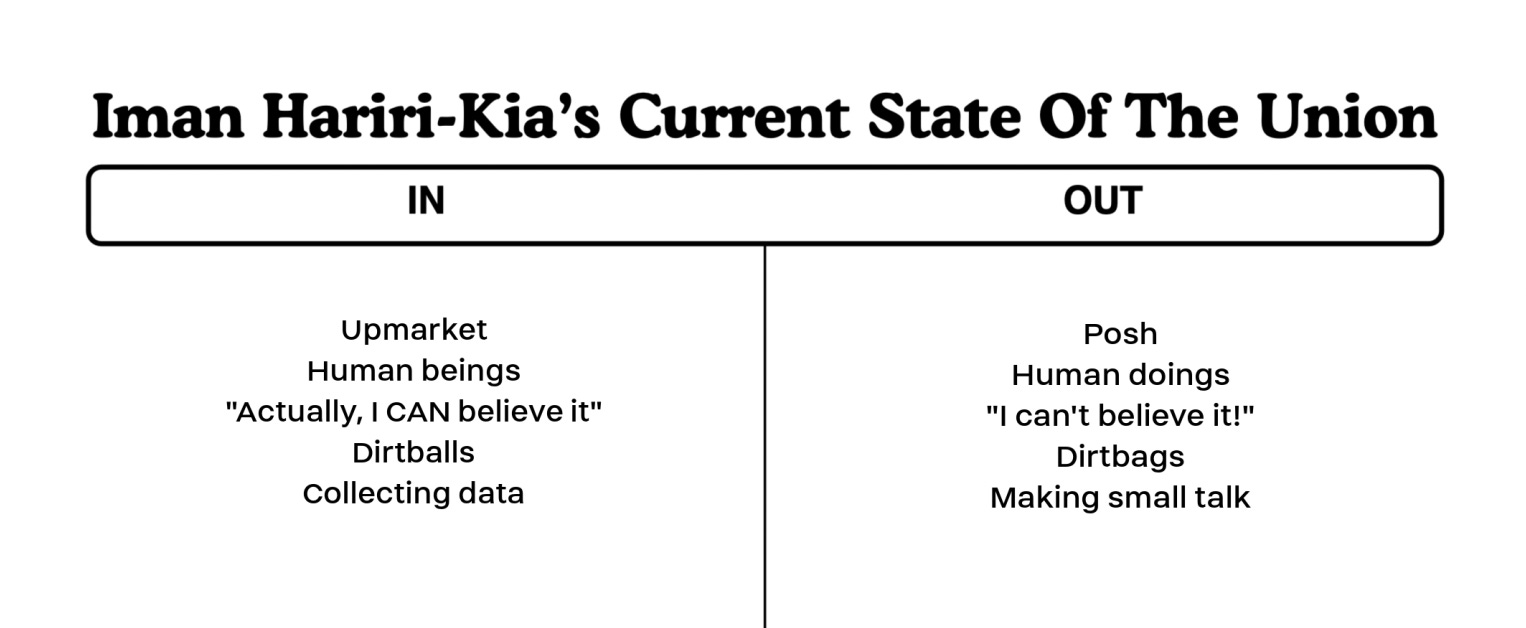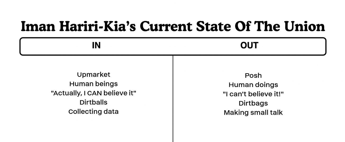 #183: CSOTUWhat's in & out this FridayIman Hariri-KiaFeb 13, 2026∙ Paid4ShareHave a very happy Valentine’s Day tomorrow, Pickers <3 I love, love, love you. I’ll TTYL on Sunday for both the Report AND this month’s coming-of-age essay!Continue reading this post for free, courtesy of Iman Hariri-Kia.Claim my free postOr purchase a paid subscription.