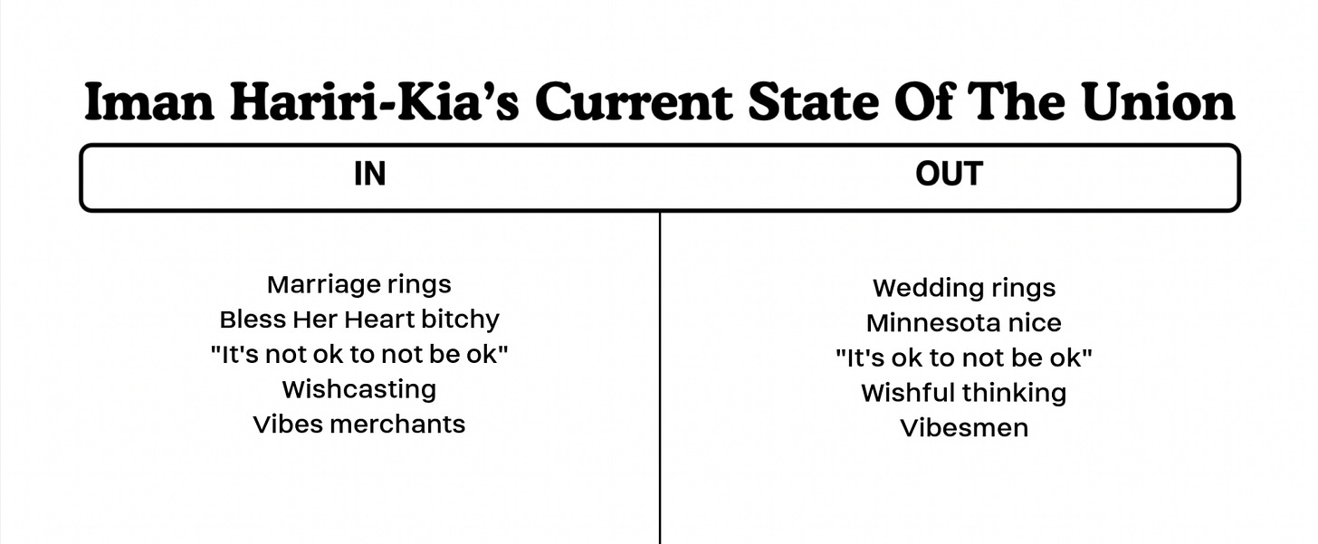#188: CSOTUWhat's in & out this FridayIman Hariri-KiaMar 20, 2026∙ Paid61ShareContinue reading this post for free, courtesy of Iman Hariri-Kia.Claim my free postOr purchase a paid subscription.